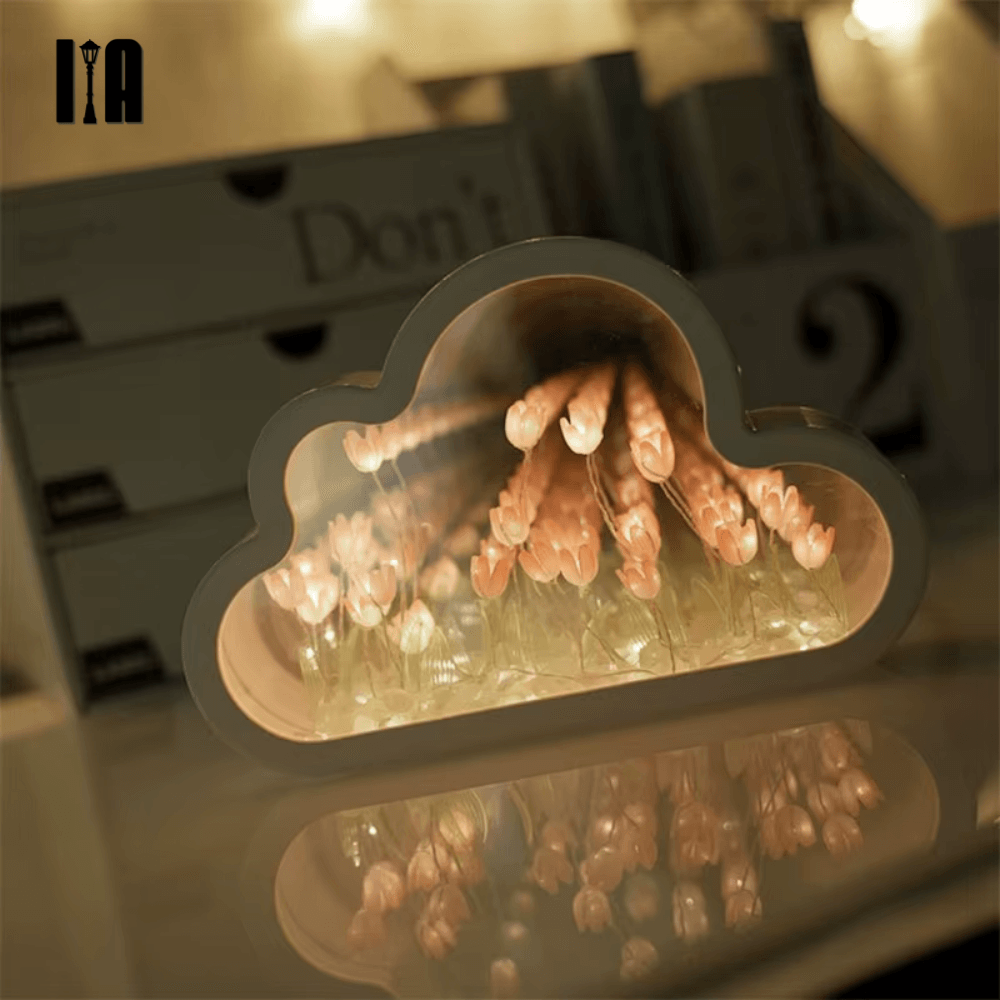 Durante o dia, funciona como um espelho elegante; à noite, se transforma em uma luminária que emite um brilho suave e acolhedor. Seu design exclusivo apresenta uma moldura espelhada e miniaturas de tulipas LED, criando um efeito mágico e infinito que encanta qualquer espaço.